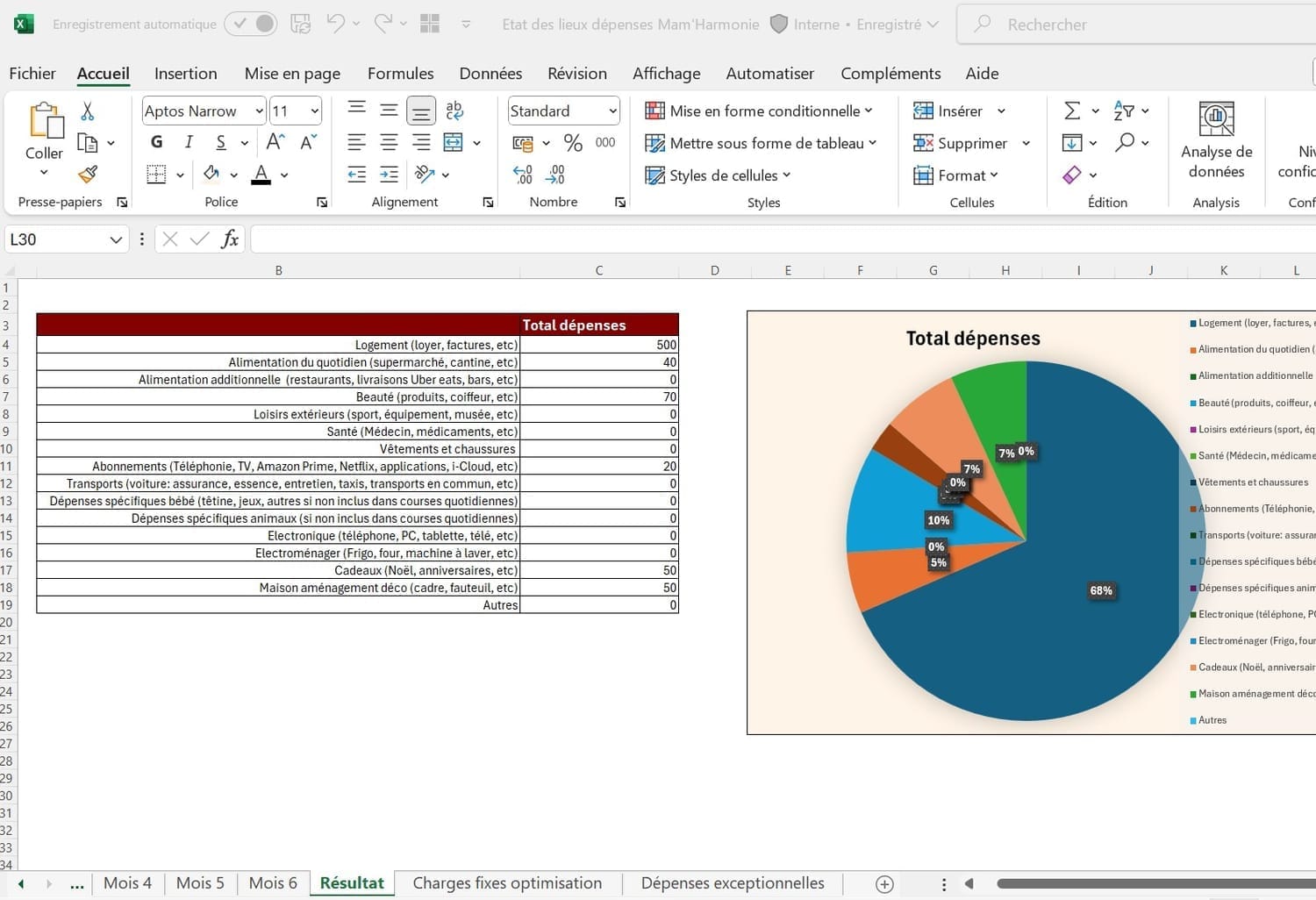 Ton Excel de suivi des dépenses sur 6 mois